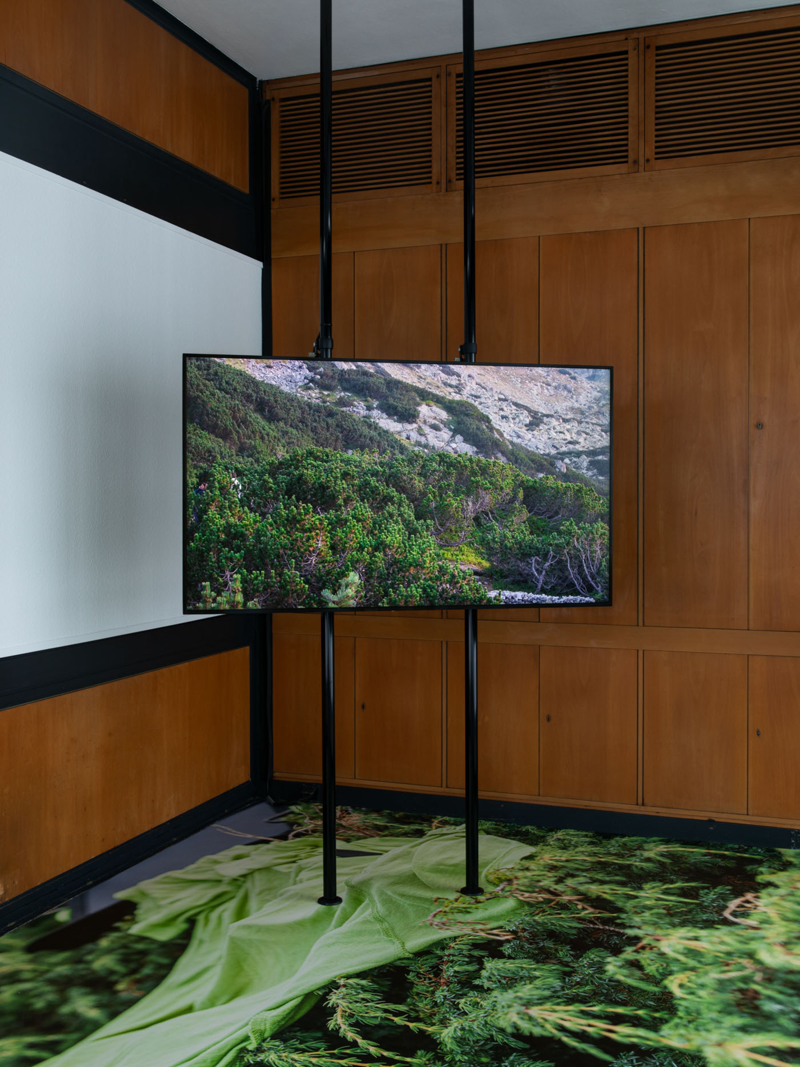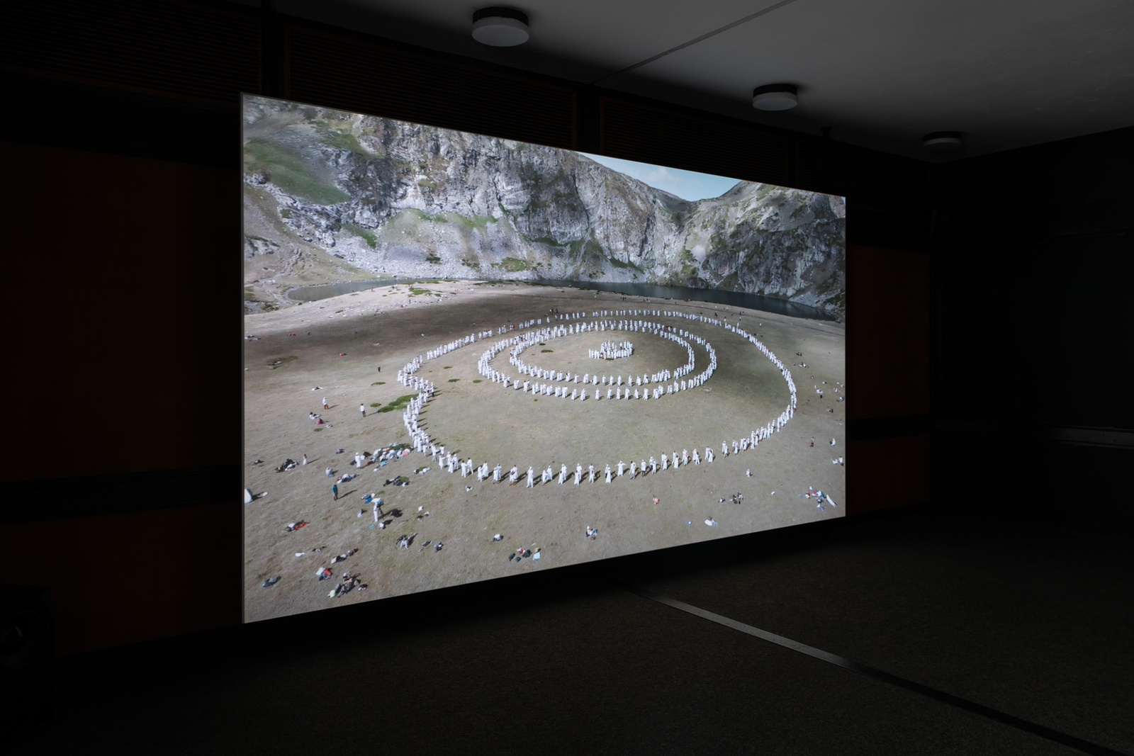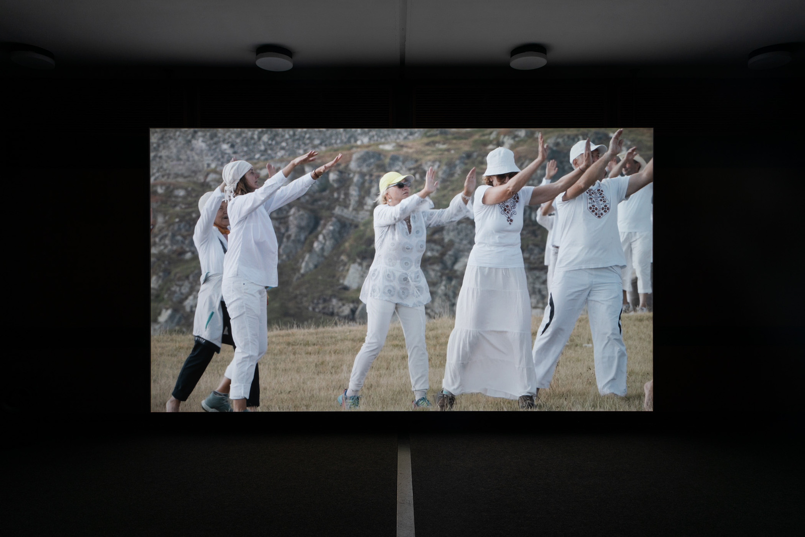 In den Eckräumen inszeniert Afsah eine Reihe von Installationen, die das zirkuläre Muster der Paneurythmie aufgreifen. Drei zusätzliche Bildschirme zeigen in Endlosschleife kurze Sequenzen, die den Auf- und Untergang der Sonne nachzeichnen und die drei Phasen des Rituals markieren. Vergrößerte Fotografien verstreuter Kleidungsstücke, die während der Dreharbeiten zu PAN entstanden sind, bedecken den Boden. Sie erinnern an jene Momente, in denen die Teilnehmenden vor und nach dem Ritual ihre Kleidung gewechselt und diese im Gebüsch oder auf dem Boden zurückgelassen haben. Die Künstlerin interessiert sich ebenso für diese Zwischenzustände – des Wartens, der Vorbereitung und der Ruhe – wie für das Ritual selbst. Die abgelegten Kleidungsstücke, knapp außerhalb der Kreise platziert, existieren zugleich unterhalb und jenseits der aufgeführten Homogenität. Still verweisen sie auf das, was beiseite gelegt wird – das Unterschiedliche und das Unvereinbare – in der spirituellen Suche nach Ganzheit und Harmonie mit der natürlichen Welt.