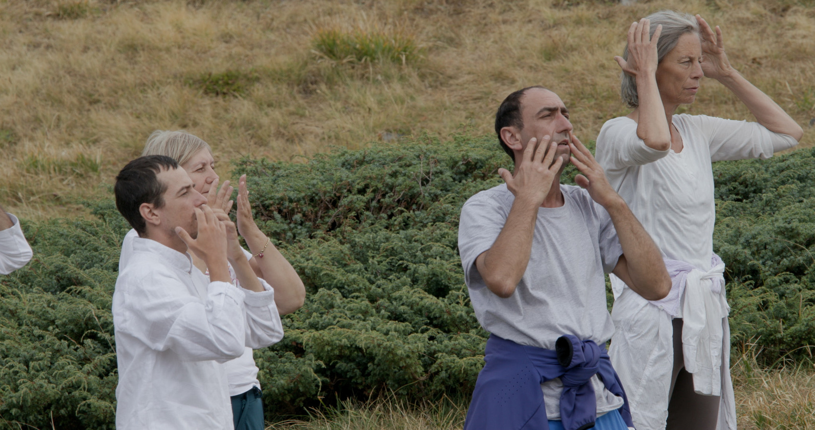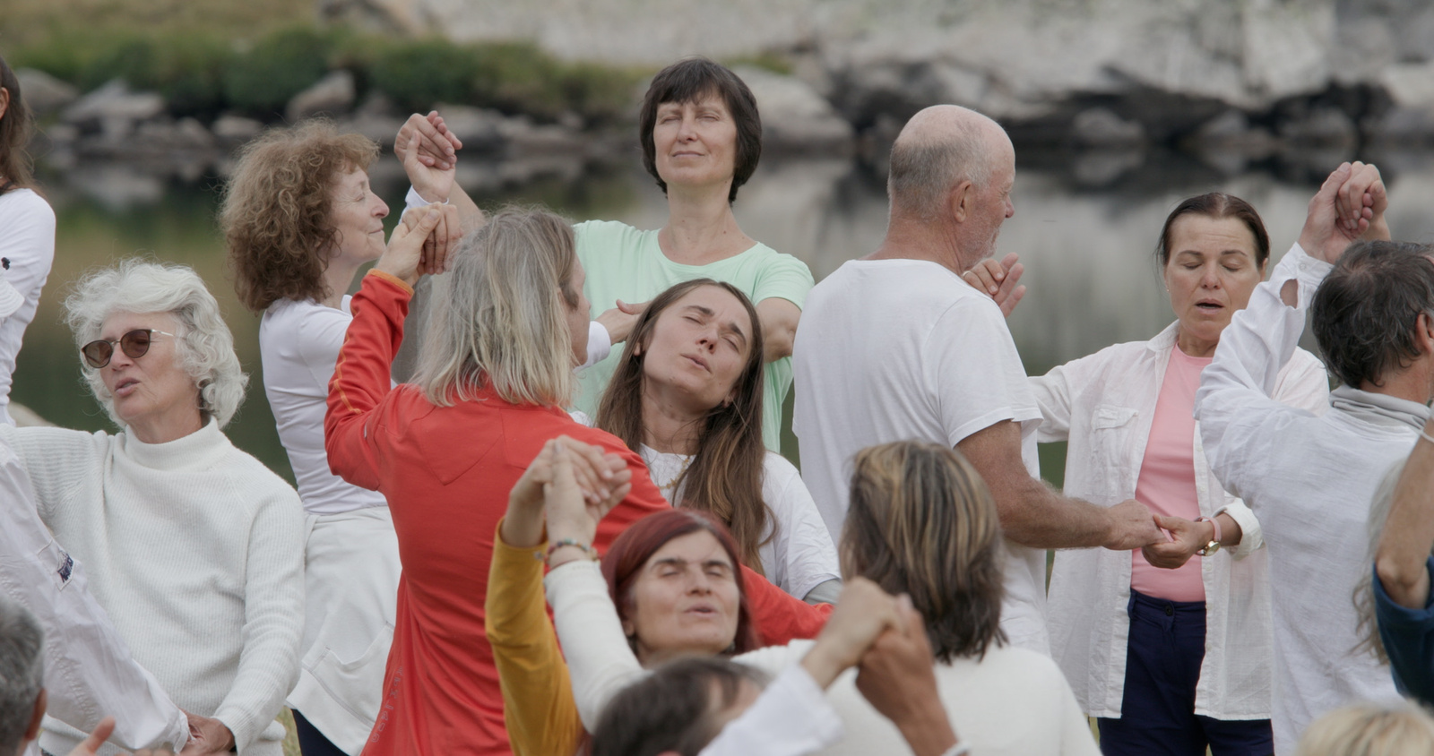 In her latest film PAN (2026), Afsah’s camera hovers above, around, and in between practitioners performing the annual ritual of Paneurhythmy in the Rila Mountains of Bulgaria—a spiritual tradition that began in the early 20th century. Following the pattern of the sun’s rise and fall, Paneurhythmy combines music, synchronized movements, and rhythmic gestures intended to attune participants’ bodies and minds to the “cosmic energy” of the surrounding landscape, promoting a harmonic connection between human and nature.