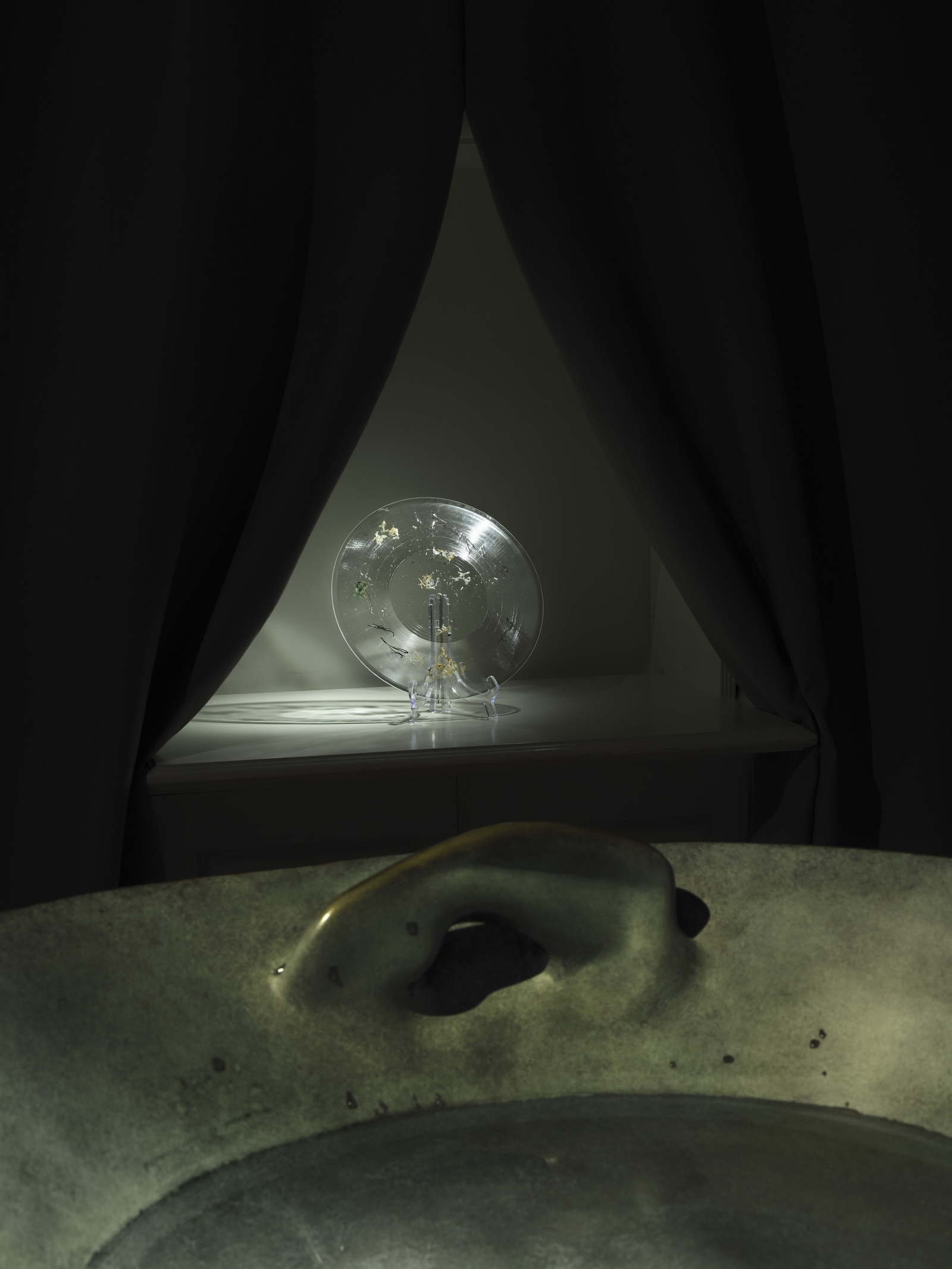 Jenna Sutela's Pond Brain (2026) presents sounds from her instrument-fountain of the same name. The water-filled bronze bowl can be played, or activated by touch and friction. Forged as the artist’s neuroplastic portrait, it resembles a spouting bowl orchestrating feedback loops of sonic vibrations and dancing droplets. The work draws on 'alt' cybernetic ideas of ponds as self-regulating, living systems, and the notion that the human brain, like a musical instrument, produces oscillatory, resonant patterns. In the installation, the bowl's frequencies interact with otherworldly resonances from oceanic and interplanetary audio libraries (star pulses, dolphin vocalizations, and beyond), shaping one another in an ongoing exchange. With each incoming cycle, a new brain is born and reflected back into its mirror image.